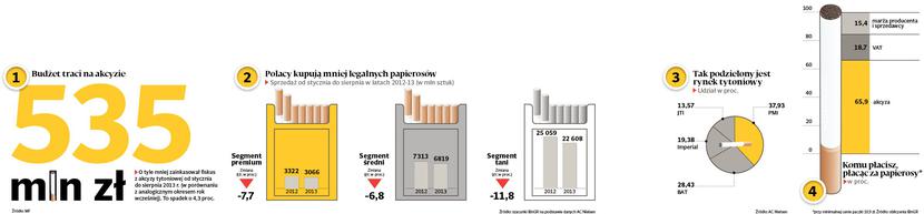 Akcyza tytoniowa w Polsce jest mieszana i składa się z dwóch części: procentowej (czyli odsetka detalicznej ceny paczki — dziś 31,41 proc.) i kwotowej (liczonej od 1000 sztuk papierosów — dziś 188 zł). W czwartek Instytut Badań nad Gospodarką Rynkową (IBnGR) opublikował raport „Podatek akcyzowy w przemyśle tytoniowym — studium efektywności systemu”, przygotowany na zlecenie Philipa Morrisa, gracza numer jeden na polskim rynku tytoniowym. Jego autorzy twierdzą, że do końca roku wpływy z akcyzy skurczą się o 800 mln zł w porównaniu z 2012 r., a receptą na pogłębienie spadków w kolejnych latach byłaby zmiana struktury akcyzy.