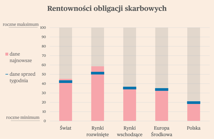 Rentowności obligacji rosły w minionych dniach, choć ruch ten był najmocniejszy na rynkach rozwiniętych. Powodem wzrostu rentowności są zwiększające się obawy o uporczywość inflacji. Intrygujący jest fakt, że obawy te najwyraźniej nie narastają już na rynkach wschodzących, mimo że z instytucjonalnego punktu widzenia rynki te słabiej są przygotowane na radzenie sobie z trwałą presją inflacyjną. Możliwe, że z punktu widzenia inwestorów stopy procentowe na rynkach wschodzących już są wystarczająco wysokie. Widać jednak tutaj pole do rozczarowań, gdy okaże się, że wysokie stopy procentowe to wciąż za mało.