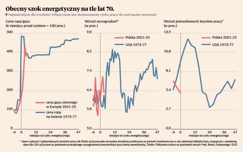 Sam szok cen energii nie jest w stanie wywołać trwałej inflacji. Ceny rosną szybko, ale jest to zjawisko jednorazowe, inflacja mija po roku. Natomiast do trwale wysokiej inflacji może doprowadzić reakcja płac, a w konsekwencji cen. W latach 70. w USA pracownicy w reakcji na wzrost cen wynegocjowali solidne podwyżki. Pomagało w tym przekonanie władz i ekonomistów, że inflacji nie należy nadmiernie zduszać. Trzeba też pamiętać, że już w 1973 r. od wielu lat trwał proces rozkręcania się dynamiki płac i cen. To w końcu prowadziło do wysokiego wzrostu jednostkowych kosztów pracy (średnia płaca przeliczona na średnią wydajność pracy), które są najważniejszym elementem determinującym dynamikę cen. W końcu inflacja tak zakorzeniła się w systemie, że nie dało się jej obniżać nawet poprzez ograniczanie popytu.
