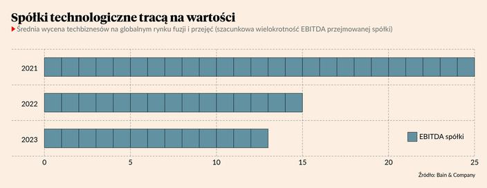 W ubiegłym roku średnia cena zakupu spółki technologicznej na świecie wynosiła 13-krotność jej zysku EBITDA. W 2022 r. wskaźnik ten wynosił średnio 15-krotność zysku, a w 2021 r. inwestorzy płacili cenę równą 25-krotność zysku firmy (szacunki Bain & Company). Ubiegły rok był najsłabszy dla rynku fuzji i przejęć od 2013 r.