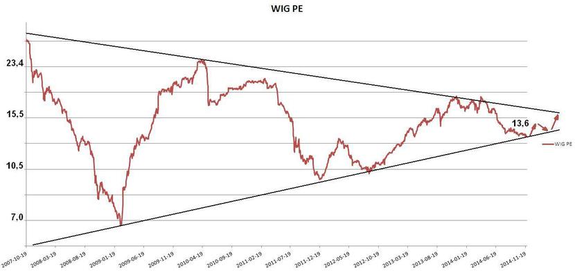 Trójkąt symetryczny, widoczny na wykresie wskaźnika cena/zysk, obliczanego dla spółek z indeksu WIG. Źródło: PB.