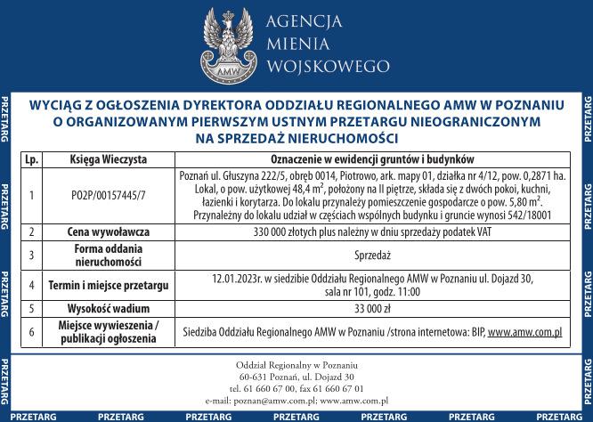 WYCIĄG Z OGŁOSZENIA DYREKTORA ODDZIAŁU REGIONALNEGO AMW Komunikat partneraopublikowano: 2022-12-02 15:30PosłuchajZostań subskrybentemi słuchaj tego oraz wielu innych artykułów w pb.pl