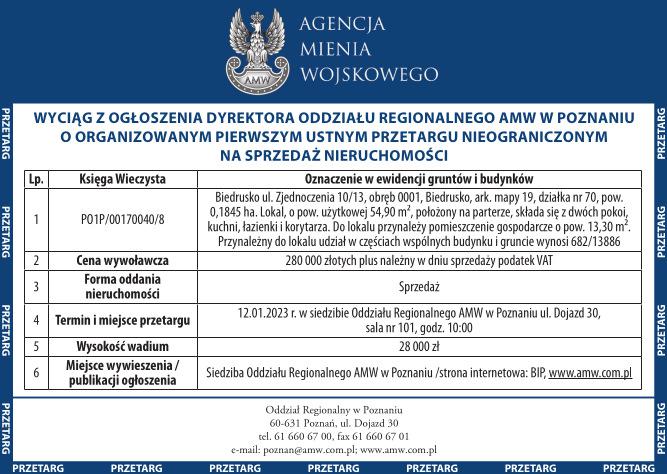 WYCIĄG Z OGŁOSZENIA DYREKTORA ODDZIAŁU REGIONALNEGO AMW W POZNANIU Komunikat partneraopublikowano: 2022-12-02 15:32PosłuchajZostań subskrybentemi słuchaj tego oraz wielu innych artykułów w pb.pl