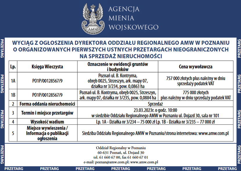 Wyciąg z ogłoszenia Dyrektora Oddziału Regionalnego AMW w Poznaniu o organizowanych pierwszych ustnych przetargach nieograniczonych na sprzedaż nieruchomości