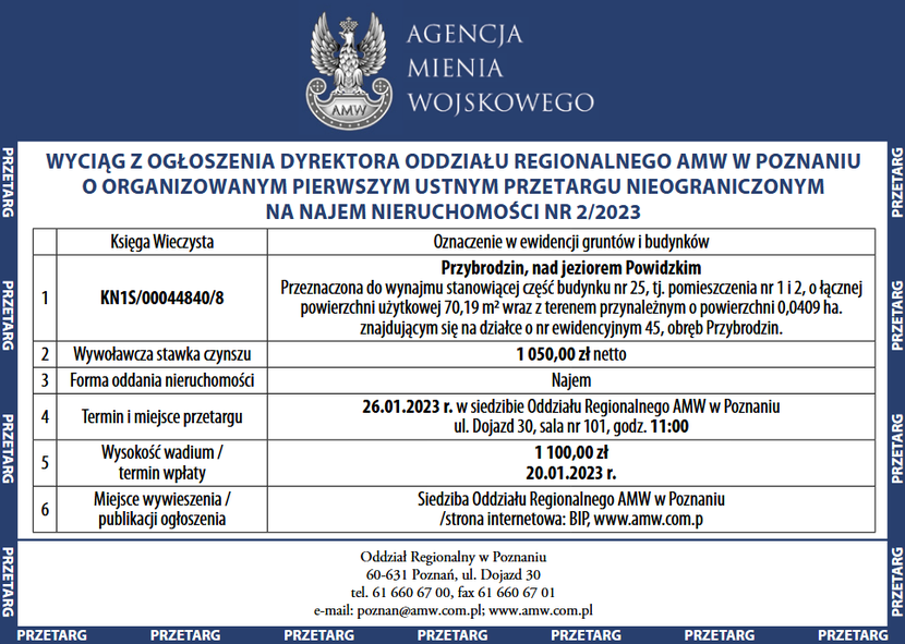 Wyciąg z ogłoszenia Dyrektora Oddziału Regionalnego AMW w Poznaniu o organizowanym pierwszym ustnym przetargu nieograniczonym na najem nieruchomości