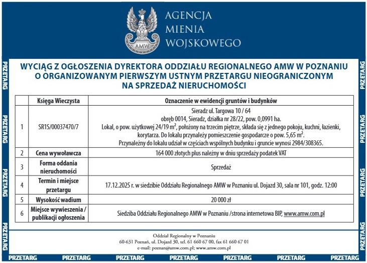 Wyciąg z ogłoszenia Dyrektora Oddziału Regionalnego AMW w Poznaniu o organizowanym pierwszym ustnym przetargu nieograniczonym na sprzedaż nieruchomości