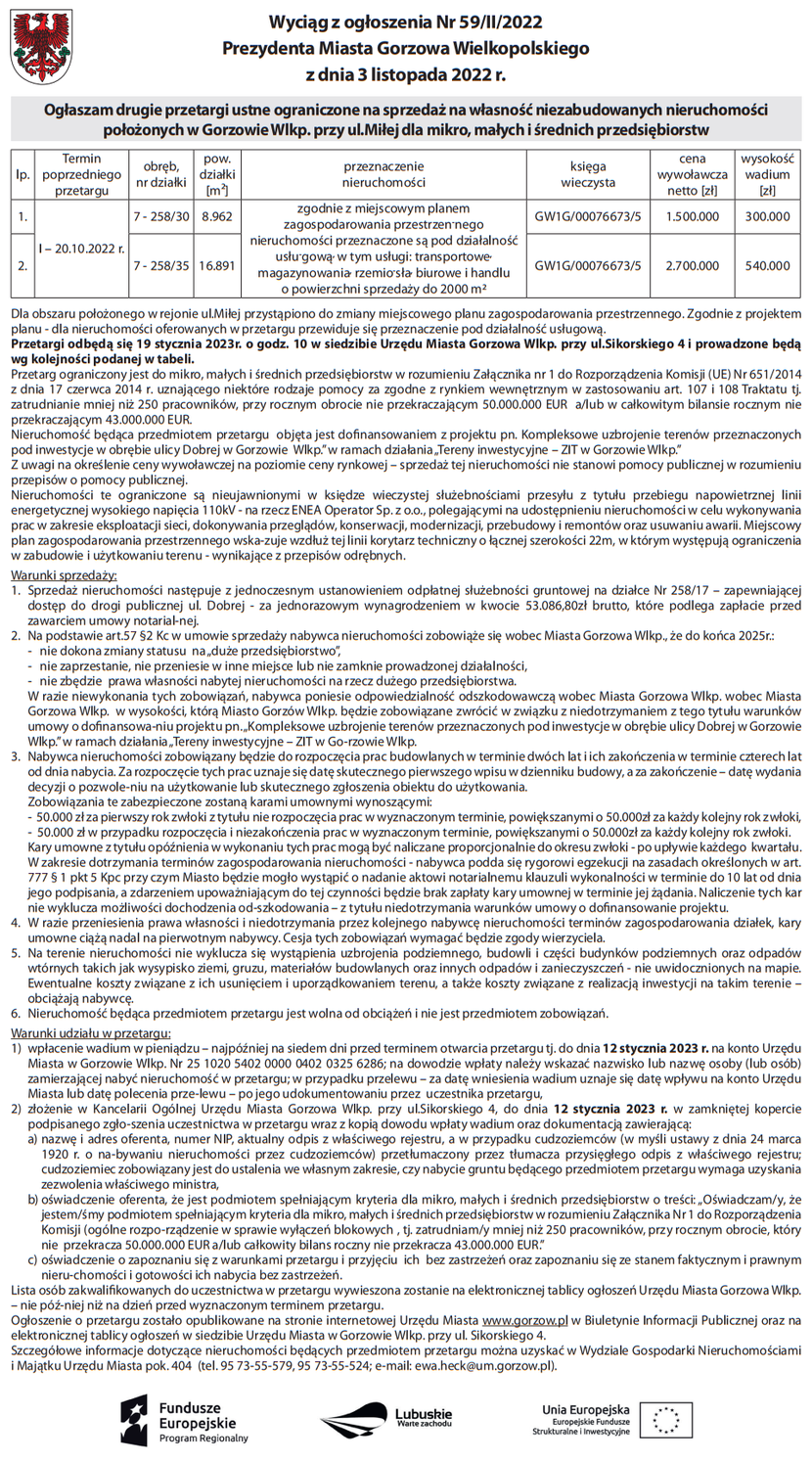Wyciąg z ogłoszenia Nr 59/II/2022 Prezydenta Miasta Gorzowa Wielkopolskiego z dnia 3 listopada 2022 r. Komunikat partneraopublikowano: 2022-11-09 15:33PosłuchajZostań subskrybentemi słuchaj tego oraz wielu innych artykułów w pb.pl