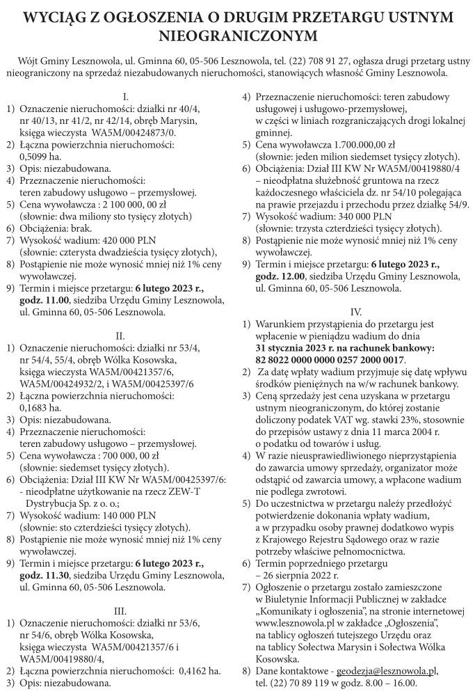 WYCIĄG Z OGŁOSZENIA O DRUGIM PRZETARGU USTNYM NIEOGRANICZONYM Komunikat partneraopublikowano: 2022-11-30 13:40PosłuchajZostań subskrybentemi słuchaj tego oraz wielu innych artykułów w pb.pl