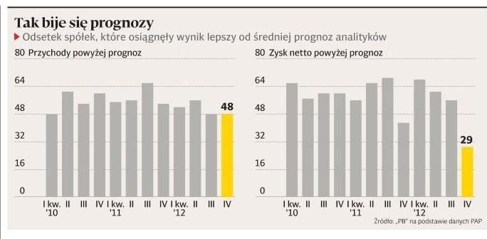 W czwartym kwartale 2012 r. polska gospodarka urosła o 1,1 proc. — to więcej, niż oczekiwali ekonomiści. Niestety, zaskoczeń w wynikach spółek giełdowych było jak na lekarstwo, a rozczarowań — bez liku. Choć już kwartał wcześniej tylko nieco ponad połowa firm sprostała oczekiwaniom ekspertów, co skłoniło ich do weryfikacji prognoz na końcówkę roku, to i tak okazało się, że były one zbyt wyśrubowane.