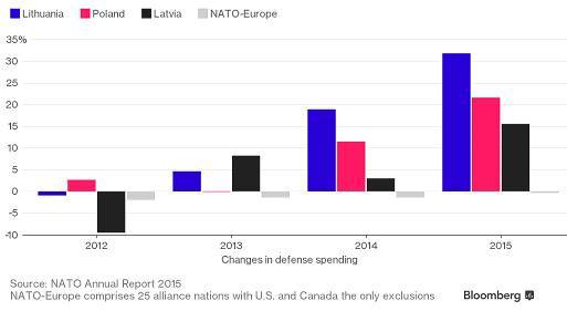W ubiegłym roku Litwa zwiększyła wydatki na obronność o 30 proc., co było najwyższym wynikiem wśród wszystkich państw NATO. Pod względem ubiegłorocznej dynamiki tych wydatków Polska uplasowała się na trzecim miejscu, dzięki czemu znalazła się wśród zaledwie pięciu krajów, dla których finansowanie wojska pochłania wymagane przez sojusz 2 proc. PKB. W ósemce najszybciej zwiększających wydatki obronne krajów NATO znalazły się także Łotwa i Estonia. Przyczyna wyścigu zbrojeń nad Bałtykiem to agresywne działania Rosji na Ukrainie, zauważa Bloomberg.