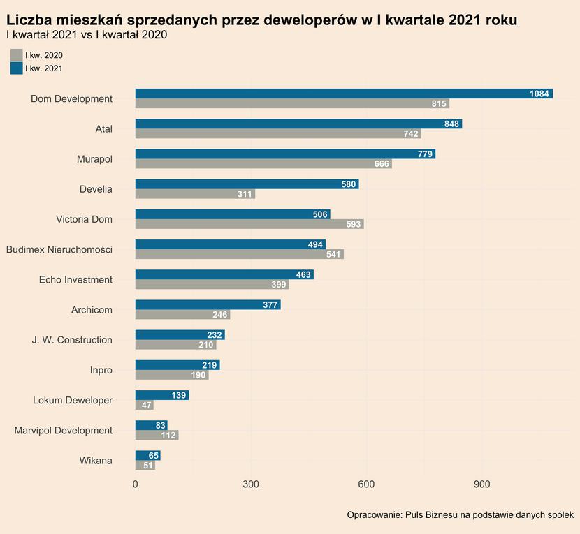 Rosnąca aktywność deweloperska jest reakcją na wysoki popyt. A ten widać po sprzedaży mieszkań. Wyniki sprzedaży największych deweloperów pokazują, że w pierwszym kwartale średnio sprzedali oni o prawie 20 proc. więcej mieszkań niż rok wcześniej. Choć należy mieć na uwadze efekty bazy, w tym znaczące ograniczenie sprzedaży w drugiej połowie marca 2020 r., to jednak wynik ten pokazuje, że na rynku panuje bardzo dobra koniunktura, napędzana głównie niskimi stopami procentowymi.
