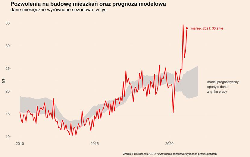 Dane o aktywności deweloperów za marzec można nazwać stratosferycznymi. Liczba wydanych pozwoleń na budowę oraz nowo rozpoczynanych mieszkań wzrosła w stopniu znacząco przekraczającym to, czego możnaby oczekiwać przy obecnej sytuacji na rynku pracy. Jak co miesiąc, pokazujemy pozwolenia i nowe budowy na tle teoretycznych wartości, wynikających z historycznej zależności między bezrobociem a rynkiem mieszkaniowym. Jak widać na wykresie, rynek mieszkaniowy leci w kosmos. W pozwoleniach widać to już było od paru miesięcy, a teraz widać też w nowych budowach. Choć za jakąś część tego nadzwyczajnego wzrostu na pewno odpowiadają przesunięcia robót związane ze zmianami pogodowymi (zima w tym roku była znacznie ostrzejsza niż w poprzednich latach).