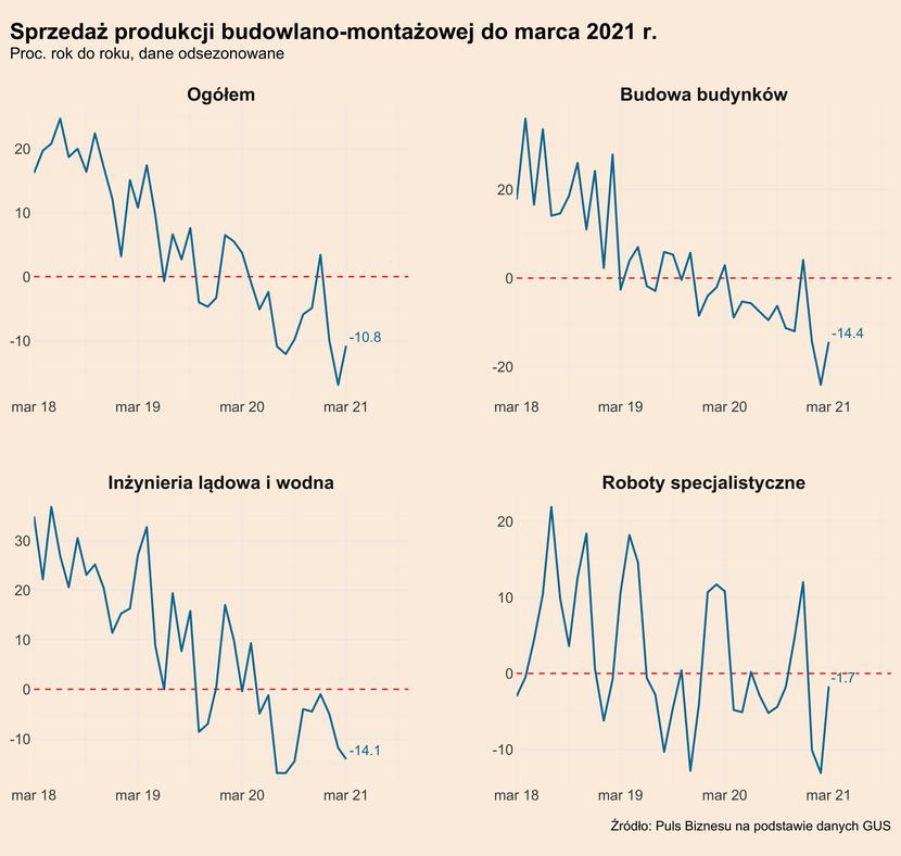 W samym budownictwie sytuacja wygląda mniej optymistycznie. W marcu sprzedaż produkcji budowlano-montażowej po odsezonowaniu była wciąż niższa o 10,8 proc. w ujęciu r/r. Największy spadek w odniesieniu do marca 2020 r. dotyczył budowy budynków oraz inżynierii wodnej i lądowej, przekraczając w obu przypadkach 14 proc..