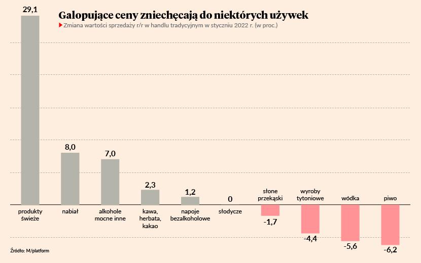 Cena wódki wzrosła średnio o 17,7 proc., nabiału o 11,9 proc., a żywności suchej o 11 proc. Konsumenci wydali średnio podczas jednej wizyty w sklepie tradycyjnym o 1,98 zł więcej niż przed rokiem.