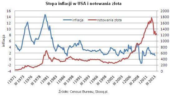 Jedynym czynnikiem, który bezsprzecznie przemawia za słabością rynku złota i równie słabymi jego perspektywami, jest niska inflacja. Patrząc na dane historyczne, rzeczywiście widać wyraźną korelację między zachowaniem notowań złota a tempem wzrostu cen. Na przestrzeni ostatnich 40 lat każdej hossie i każdemu szczytowi na rynku kruszcu towarzyszyły analogiczne tendencje inflacyjne. Działo się tak w latach 70-tych, od 2002 do 2005 r. oraz w okresie 2007-2008, także 2010-2011. Najdłuższa bessa na rynku złota, trwająca od końca 1980 do początku 2001 r., przypadła na lata trwale spadającej inflacji. Podobne zjawisko można obserwować obecnie. Rekordowy poziom notowań złota pokrywał się niemal idealnie z ostatnim szczytem poziomu inflacji w Stanach Zjednoczonych. Od tego czasu, czyli od trzeciego kwartału 2011 r. tempo wzrostu cen obniżyło się z 3,9 do 1,2 proc., czyli o ponad dwie trzecie, a cena złota poszła w dół o ponad jedną trzecią. Największy krach na rynku złota, gdy notowania spadły o 67 proc., miał miejsce od początku 1980 do połowy 1983 r., a więc w czasie, w którym inflacja w USA obniżyła się z rekordowych 15 do 2,6 proc.