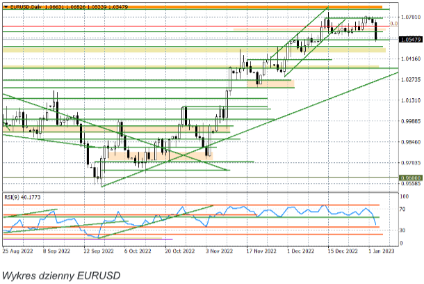 Niepokojące doniesienia z Chin w temacie koronawirusa dają pretekst do ruchu risk-off, który zaczyna podbijać dolara. Jednocześnie perspektywa hamowania inflacji w największych gospodarkach może skłaniać część inwestorów do ponownego przeszacowania potencjalnych ruchów ze strony banków centralnych. Widać to dobrze po zachowaniu się euro, które zareagowało spadkiem na napływające szacunki inflacji CPI z niemieckich landów wskazujące na jej wyraźniejsze wyhamowanie w grudniu. Zbiorcze dane dla Niemiec poznamy o godz. 14:00 - prognoza zakłada wyhamowanie wskaźnika CPI do 9,1 proc. r/r z 10,0 proc. r/r. Poza wspomnianymi danymi dzisiaj poznamy też "zaległe" dane PMI dla przemysłu dla tych krajów, które wczoraj jeszcze świętowały tj. Wielkiej Brytanii, USA i Kanady. Ważnymi punktami kalendarza w tym tygodniu będą też dane PMI/ISM dla usług, zapiski z grudniowego posiedzenia FED, czy też dane Departamentu Pracy USA.
