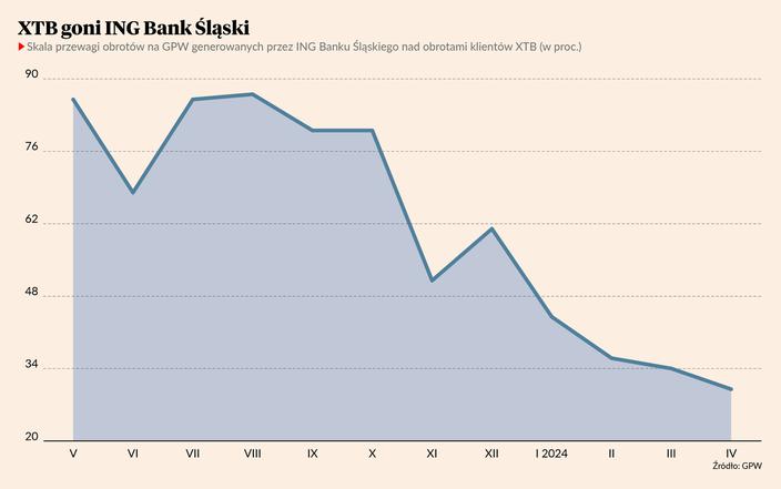 Obroty sesyjne akcjami na GPW niespełna 30 proc. wyższe od tych, jakie generują klienci XTB, wykręcili w kwietniu 2024 r. inwestorzy korzystający z usług biura maklerskiego ING Banku Śląskiego. Dotychczas był to zdecydowany lider wśród brokerów obsługujących wyłącznie inwestorów detalicznych. Jeszcze w 2023 r. klienci ING generowali zwykle obroty o 80 proc. wyższe od tych, jakie przechodziły przez XTB. Choć już wcześniej można było dostrzec symptomy podkopywania pozycji ING, to w 2024 r. XTB zaczęło miesiąc w miesiąc zmniejszać dystans do lidera.