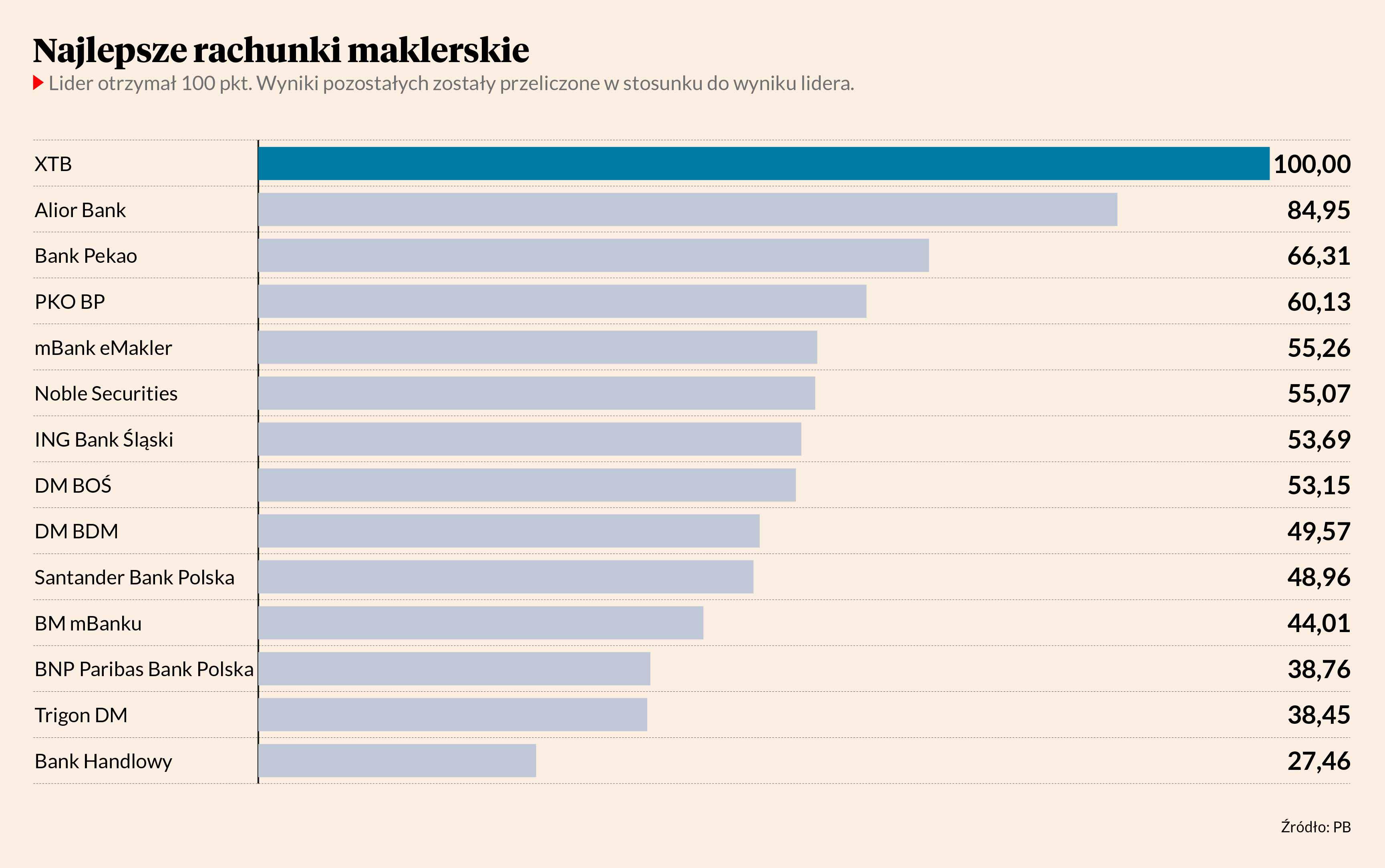 Rachunki porównywaliśmy pod kątem ich przydatności dla aktywnego inwestora indywidualnego, każdego złotego wypadającego z jego kieszeni traktując jako punkt karny. Na koniec zsumowaliśmy rezultaty, przykładając 70-procentową wagę do kosztów wprost wynikających z tabel opłat i 30-procentową temu, co można uznać za komfort obsługi. Następnie wynik zwycięzcy przeliczyliśmy na 100 pkt, a rezultaty kolejnych — w relacji do wyniku lidera.