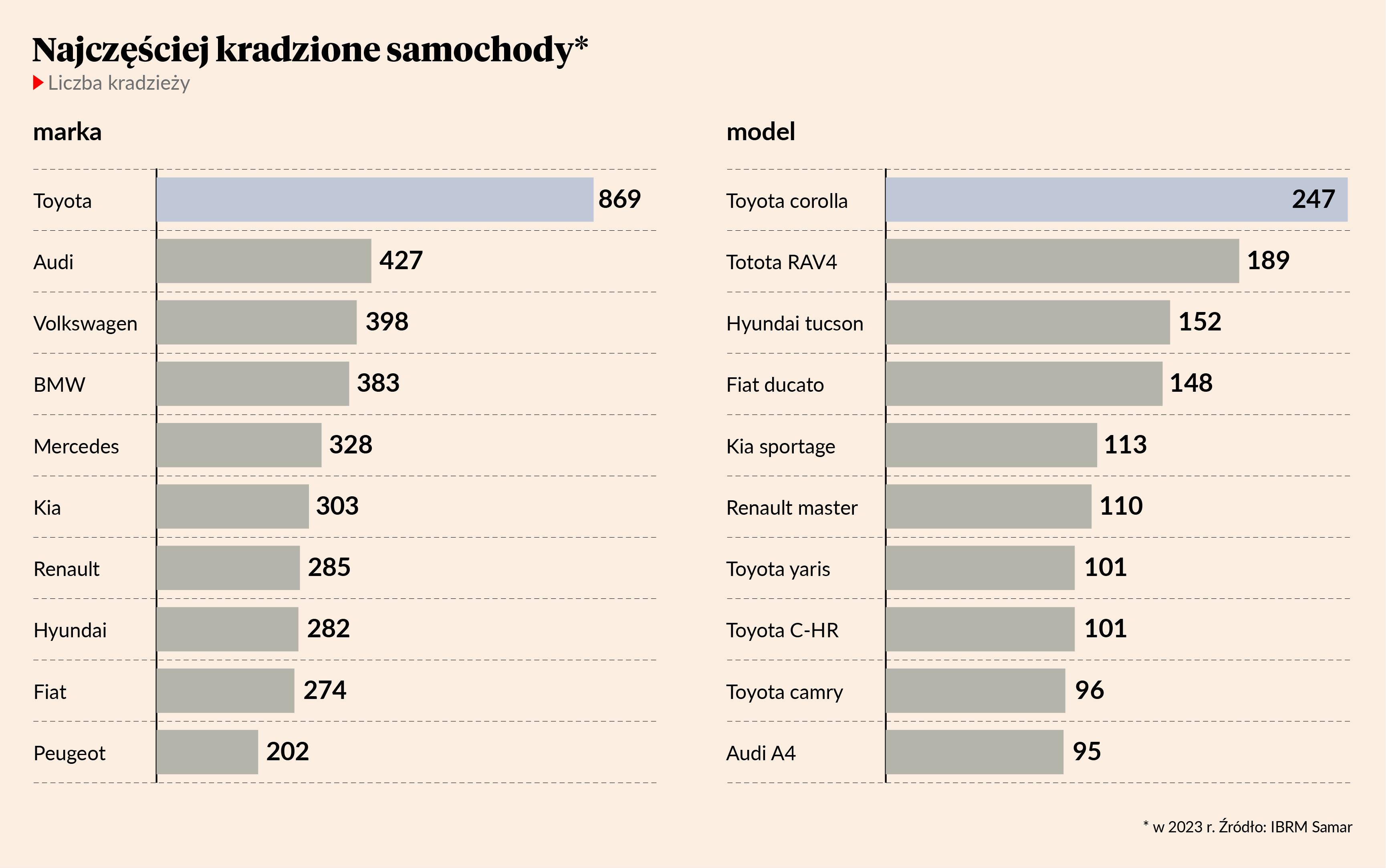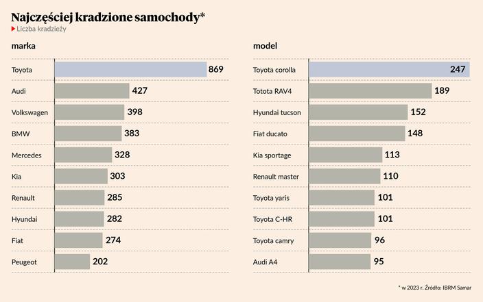 Najczęściej kradzioną marką aut jest niezmiennie od kilku lat Toyota (w 2023 r. zginęło 869 aut tej marki). Cztery kolejne miejsca należą do Audi (427), Volkswagena (389), BMW (383) i Mercedesa (328).
