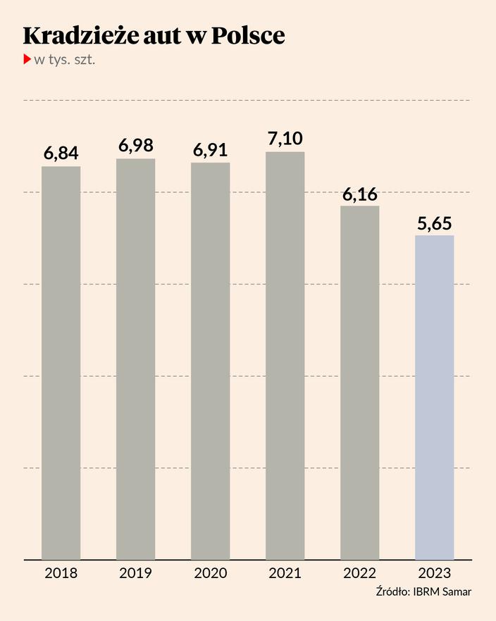Z analizy Centralnej Ewidencji Pojazdów i Kierowców, przeprowadzonej przez Samar, wynika że w 2023 r. z powodu kradzieży wyrejestrowano w Polsce zaledwie 5 646 pojazdów z grupy osobowych i dostawczych (o dmc do 6 ton.) To o 8,3 proc. mniej niż rok wcześniej, Liczba ta to również niecałe 0,03 proc. liczącego ponad 22 mln polskiego parku aut osobowych i dostawczych.
