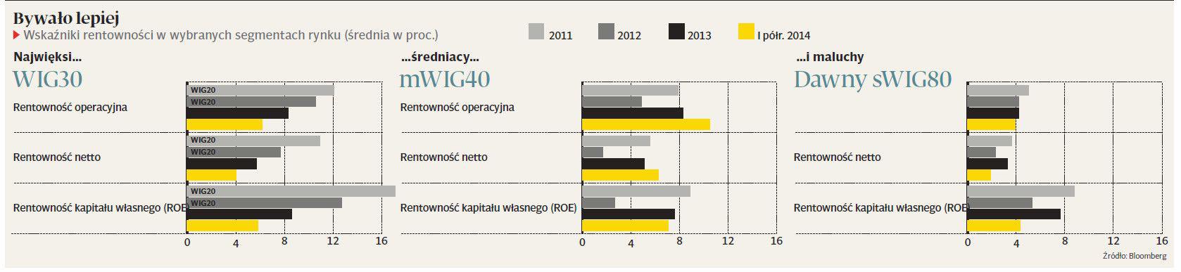 — Spółkom przeszkadzało słabnące PKB w kraju i w Europie Zachodniej oraz konflikt na Wschodzie — warto pamiętać, że dużo firm eksportuje wyroby i usług do Rosji i na Ukrainę. Pomagały natomiast rekordowo niskie stopy procentowe, pogoda i ograniczanie kosztów działalności. W tym samym okresie wyceny dużej części spółek spadły, a więc relacja wyników do wycen poprawiła się z punktu widzenia inwestorów — ocenia Bartłomiej Cendecki, zarządzający funduszami Quercus TFI.