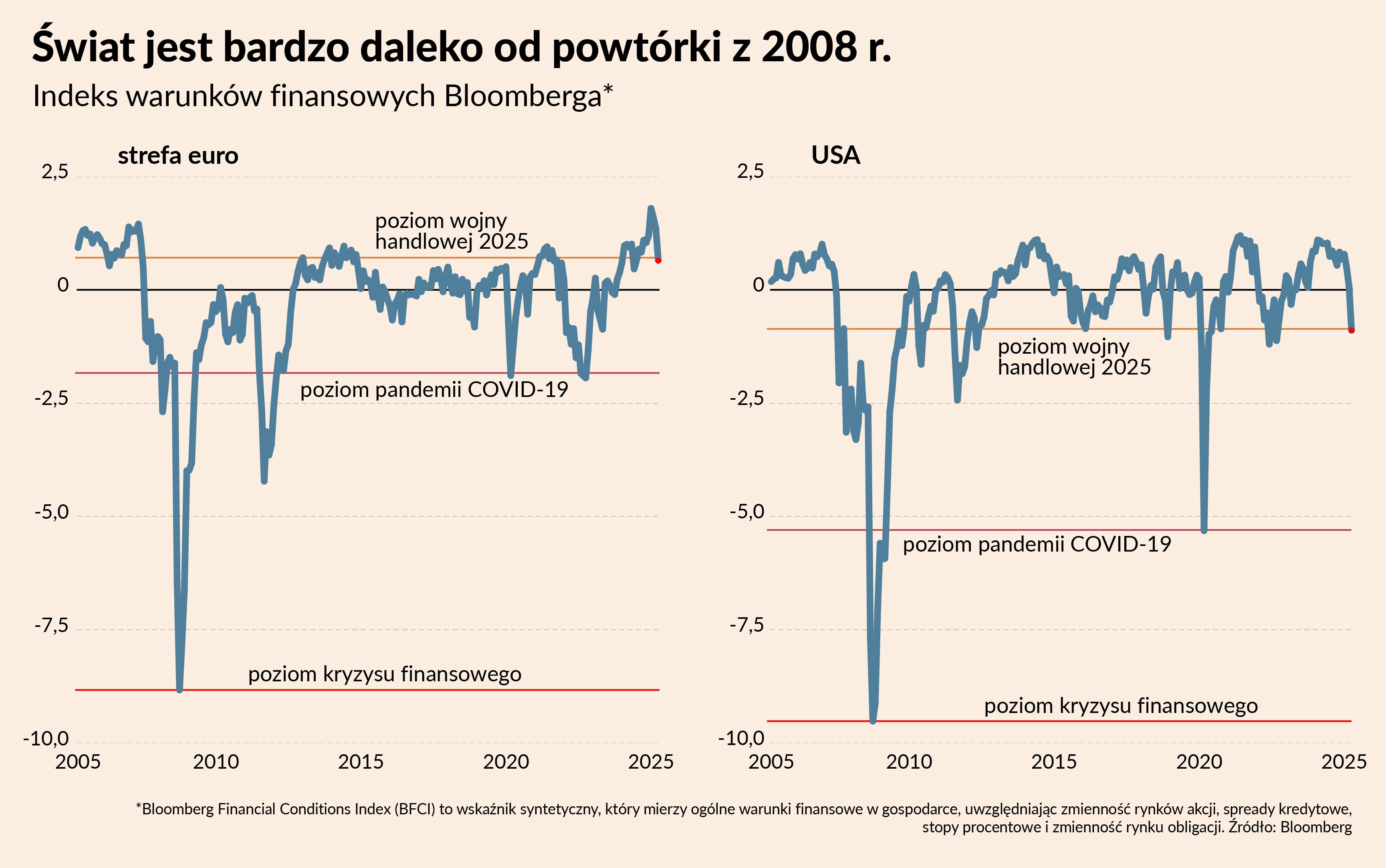 Na razie jednak jesteśmy daleko od stresu finansowego, który cechuje głębokie kryzysy. Widać to po wielu wskaźnikach, a najlepszym podsumowaniem jest Bloomberg Financial Conditions Index, który pokazuje, jakie są warunki finansowania na rynkach — apetyt na ryzyko, dostępność pieniądza, stabilność źródeł finansowania, niebezpieczeństwo niewypłacalności emitentów itd. W przypadku USA ten indeks jest na poziomie dołków z 2022 r., a w przypadku strefy euro na poziomie z połowy zeszłego roku. W obu przypadkach indeks wciąż jest oddalony o dwa odchylenia standardowe od poziomów z pandemii i cztery-sześć odchyleń od poziomów z kryzysu finansowego. Jest on dużo wyżej, niż był przez rok przed upadkiem Lehman Brothers. Trudno nawet w tym momencie porównywać te kryzysy.