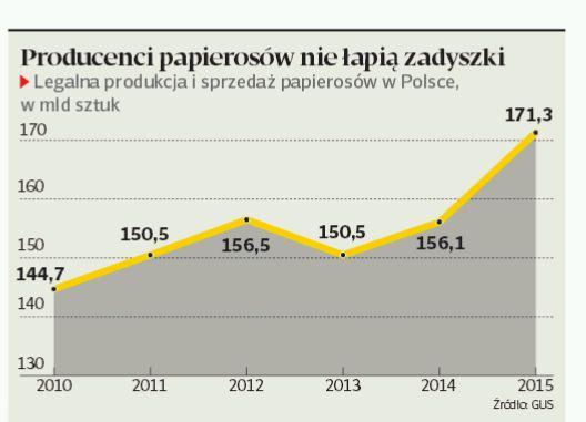 W tym roku tylko do końca maja polskie fabryki wyprodukowały 83,6 mld papierosów, czyli wystarczająco, by zaspokoić krajowy popyt przez dwa lata. To o jedną czwartą więcej niż rok wcześniej — przedstawiciele koncernów tłumaczyli, że wzrost był spowodowany koniecznością zrobienia zapasów przed wejściem w życie zapisów unijnej dyrektywy tytoniowej.