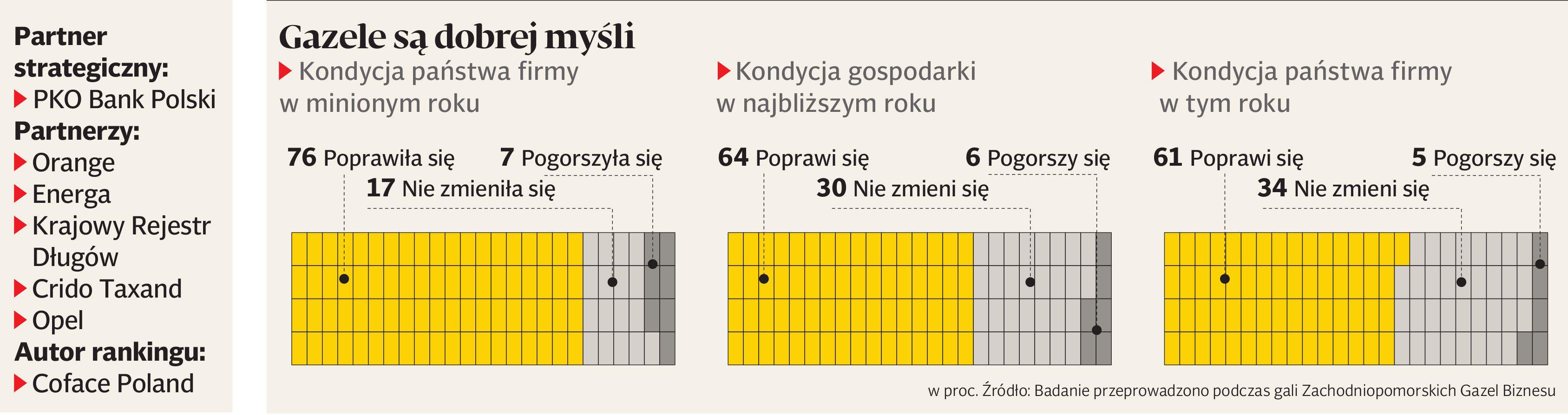 Nie udało się też za pierwszym podejściem skorzystać z dotacji, która miała zostać przeznaczona na budowę zakładu. Firma dostała dofinansowanie w wysokości 4 mln zł, po trzech latach, kiedy zakład został wybudowany. Dancook ma dzisiaj ok. 50 proc. udziału na rynku sprzętu do grillowania. 60 proc. swoich wyrobów eksportuje. Trzecie miejsce w województwie zachodniopomorskim zajęła spółka Petro-Oil Zachód, rozprowadzająca produkty smarne firmy Orlen Oil. W całym województwie wyróżniliśmy 126 najdynamiczniej rozwijających się małych i średnich firm, które podczas gali narzekały głównie na ustawodawstwo, ale chwaliły polski rynek za to, że jest tu jeszcze sporo do zrobienia. W ubiegłorocznej edycji w Szczecinie wyróżnienia odbierało więcej, bo aż 142 laureatów. Gazele Biznesu już po raz 14. organizuje „Puls Biznesu”. Autorem rankingu jest Coface.
