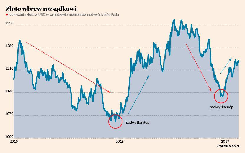 Od grudniowej podwyżki stóp Fedu złoto, notowane w dolarze, umocniło się o 7 proc. To może zaskakiwać znających teorię finansów, zgodnie z którą nie wypłacające kuponów ani dywidend złoto powinno tracić na wzroście kosztu pieniądza. Jest to już trzeci raz z rzędu, kiedy złoto w podobny sposób reaguje na zaostrzenie polityki amerykańskiego banku centralnego. W ciągu dwóch miesięcy od poprzedniej podwyżki z grudnia 2015 r. złoto podrożało o 13 proc., a w reakcji na ostatnie przed kryzysem zaostrzenie polityki z czerwca 2006 r. zyskało 6 proc.