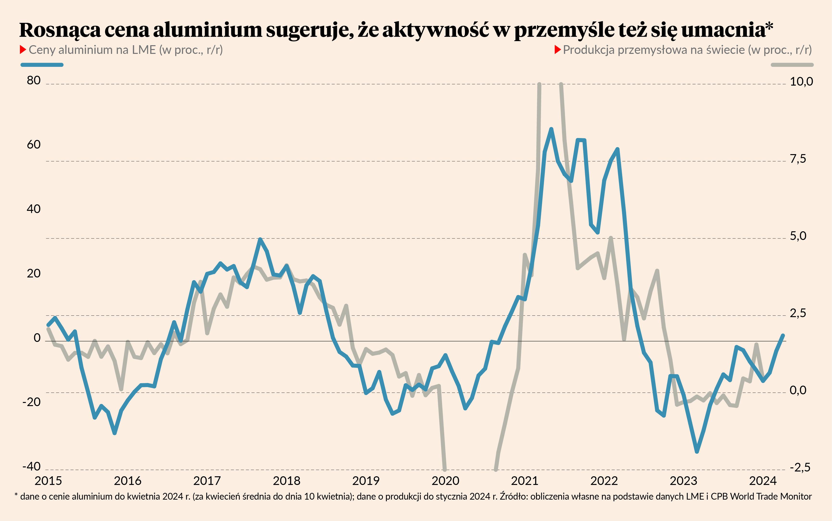 Oba metale są surowcami najbardziej skorelowanymi z produkcją przemysłową, co pokazuję na wykresie na przykładzie aluminium. Wzrost cen miedzi i aluminium można więc odczytywać jako sygnał rosnącego na świecie popytu. Wpływ na ten wzrost mogą mieć oczywiście także problemy podażowe, ale takie zaburzenia są zwykle specyficzne dla poszczególnych metali i nie wywołują jednoczesnych ruchów cen.