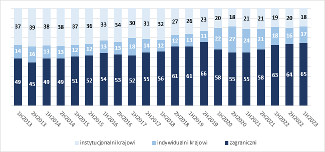 Zainteresowanie polską giełdą ze strony dużych inwestorów z zagranicy rosło przez kilka ostatnich lat. Jak wynika z danych GPW, zebranych na podstawie zleceń maklerskich, tendencja się utrzymała - w I półroczu 2023 r. ich udział w obrotach na rynku głównym wyniósł 65 proc., co było rekordowym wynikiem dla pierwszego półrocza w ciągu ostatniej dekady. Odczyt był o 2 pkt proc. wyższy niż w analogicznym okresie rok temu, kosztem lokalnych graczy giełdowych. Udział polskich instytucji i drobnych inwestorów w obrotach na głównym rynku GPW spadł po 1 pkt proc. do 18 i 17 proc.