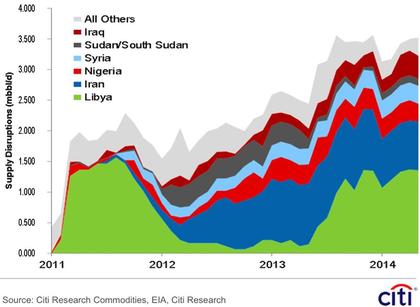 Zdaniem specjalistów Citigroup zakłócenia dostaw nie doprowadziły do trwałej zwyżki cen surowca, ponieważ słaba koniunktura na świecie prowadzi do zmniejszenia popytu, a rewolucja łupkowa umożliwia zwiększenie podaży ropy.
