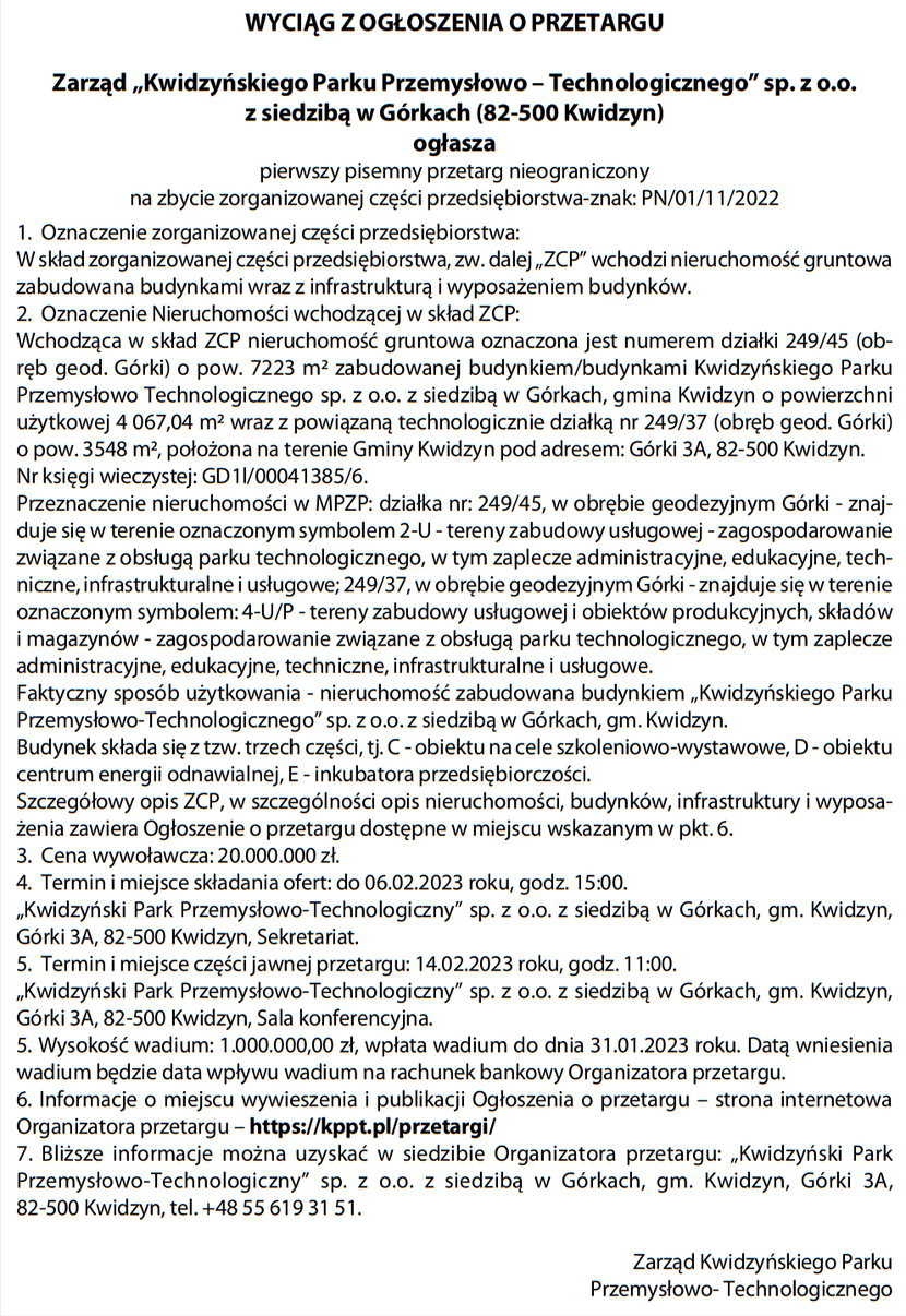 Zarząd „Kwidzyńskiego Parku Przemysłowo – Technologicznego”, ogłasza pierwszy pisemny przetarg nieograniczony Komunikat partneraopublikowano: 2022-11-28 14:27PosłuchajZostań subskrybentemi słuchaj tego oraz wielu innych artykułów w pb.pl