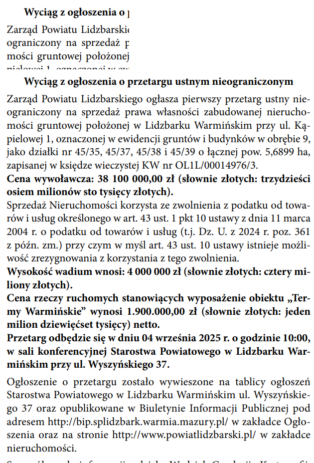 Zarząd Powiatu Lidzbarskiego ogłasza pierwszy przetarg ustny nieograniczony na sprzedaż prawa własności zabudowanej nieruchomości gruntowej