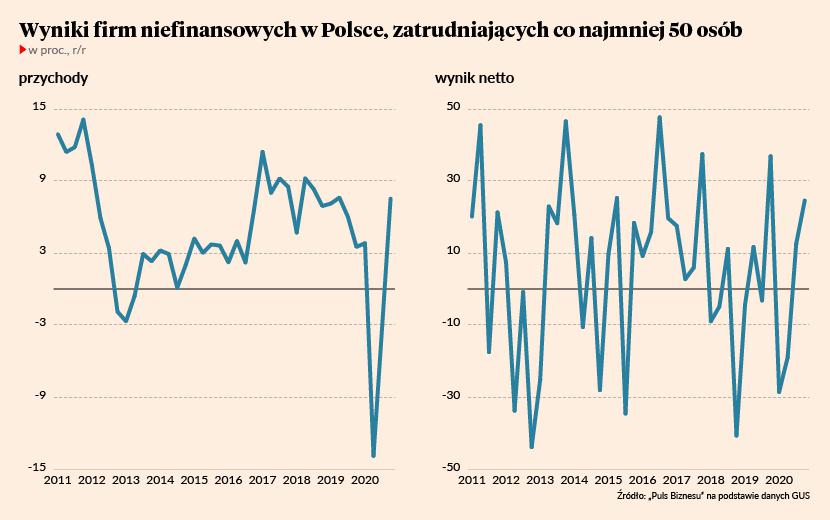 W czwartym kwartale przychody przedsiębiorstw, które zatrudniają co najmniej 50 osób i nie są firmami finansowymi, wzrosły r/r aż o 7,5 proc., czyli były wyraźnie wyższe niż przed pandemią, mimo że cała gospodarka znajdowała się w tym czasie w recesji. Realny PKB w ostatnim kwartale 2020 r. spadł o 2,8 proc. r/r.