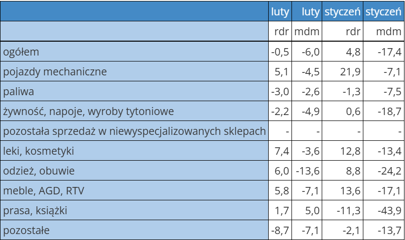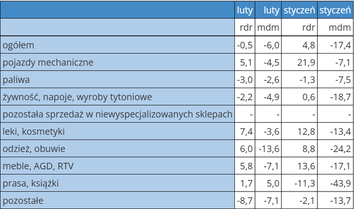 Poniżej dane o dynamice sprzedaży detalicznej w cenach stałych w lutym i styczniu 2025 r.: