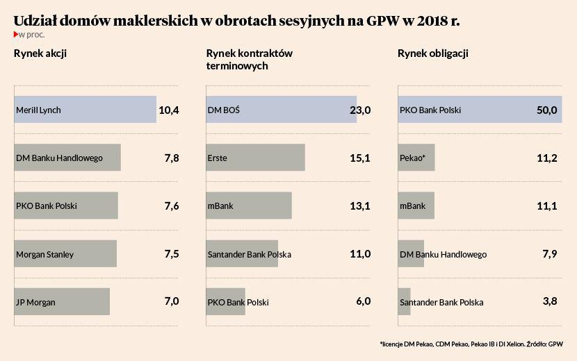 Sądząc po tym jaki jest udział poszczególnych domów maklerskich w obrotach na polskiej giełdzie, „polską” jest ona już niemal tylko z nazwy. Największe obroty sesyjne na rynku akcji w 2018 r. wygenerowali bowiem klienci Merrill Lynch. To jeden z tzw. zdalnych członków giełdy, a więc brokerów, którzy nie mają w Polsce czegoś, co można nazwać biurem maklerskim, ograniczających swoją styczność z Giełdą Papierów Wartościowych w Warszawie (GPW) do połączenia systemów informatycznych.