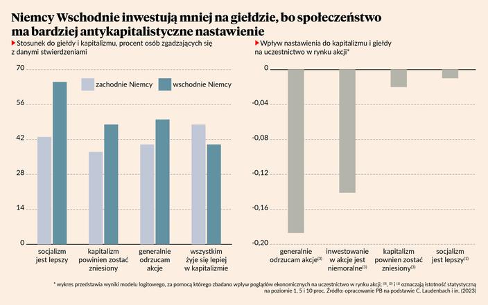 Inspirujące badanie zatytułowane „The Long-Lasting Effects of Experiencing Communism on Attitudes Towards Financial Markets” pokazuje, że życie pod socjalistyczną doktryną wpajającą antykapitalistyczną propagandę do pewnego stopnia wyjaśnia, dlaczego mieszkańcy Niemiec wschodnich są obecnie mniej aktywni na giełdzie w porównaniu do mieszkańców Niemiec zachodnich. Różnica w posiadaniu akcji, funduszy akcyjnych i ETF-ów wynosi prawie 30 proc.