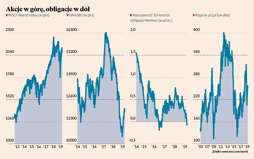 O ile posunięcia Amerykanów zdradzały oznaki zwątpienia i zdenerwowania, to włodarze Europejskiego Banku Centralnego przeszli w stan regularnej paniki. Mario Draghi i spółka przedłużyli obietnicę utrzymania niedodatnich stóp procentowych „przynajmniej do końca 2019” i nieoczekiwanie przyspieszyli uruchomienie awaryjnych pożyczek dla sektora bankowego (TLTRO III), przy okazji rewidując w dół prognozy gospodarcze. Ta rejterada bankierów centralnych wsparła wyceny akcji i obligacji, lecz z drugiej strony potwierdziła obawy, że z realna gospodarką nie jest najlepiej. Odwrót z drogi ku monetarnej normalności sprawił, że inwestorzy przeprosili się z obligacjami skarbowymi. Rentowność amerykańskich 10-letnich obligacji skarbowych, która jeszcze w listopadzie przekraczała 3,25 proc., pod koniec marca zanurkowała do 2,35 proc. — najniższego poziomu od 2017 r. W rezultacie w USA doszło do pierwszego od 2007 r. odwrócenia krzywej terminowej, czyli sytuacji, w której 3-miesięczne bony skarbowe mają wyższą rentownosć niż 10-letnie obligacje. A ponieważ odwrócenie krzywej poprzedziło każdą amerykańską recesję w ciągu ostatnich 40 lat, jest to bardzo niepokojący sygnał dla realnej gospodarki.