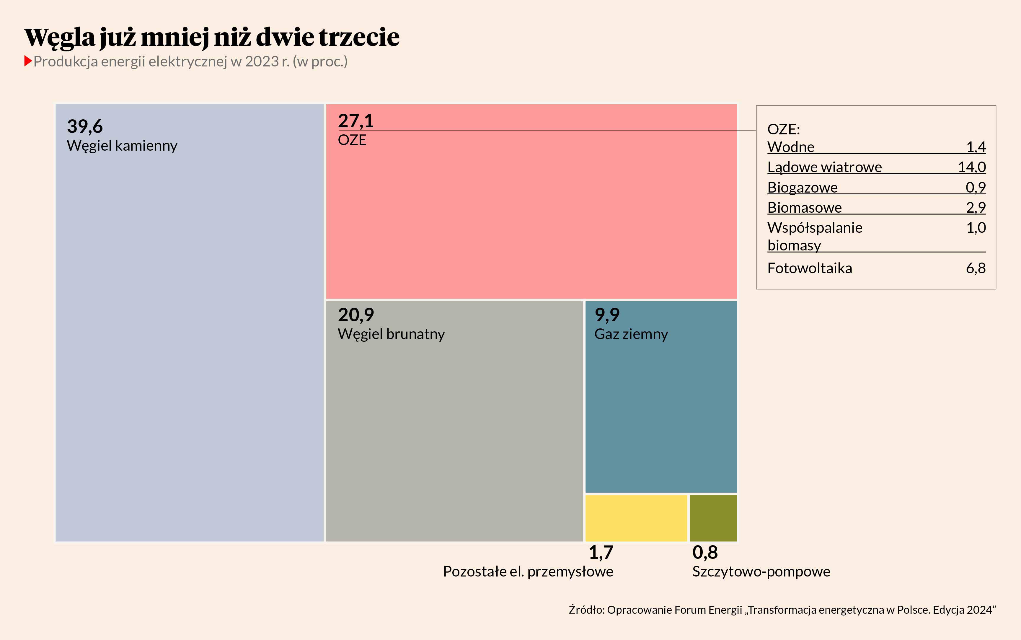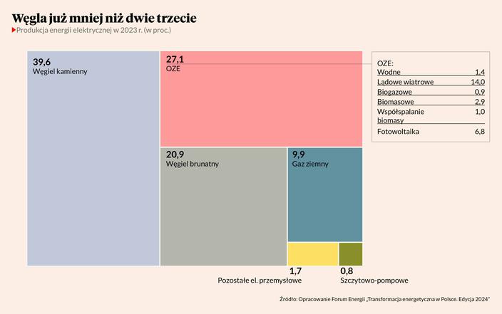Tak mało węgla w prądzie nie mieliśmy w Polsce jeszcze nigdy. W 2023 r. jego udział w miksie energetycznym zmniejszył się do poziomu najniższego w historii, czyli do 60,5 proc. Rok wcześniej było to jeszcze 70 proc.