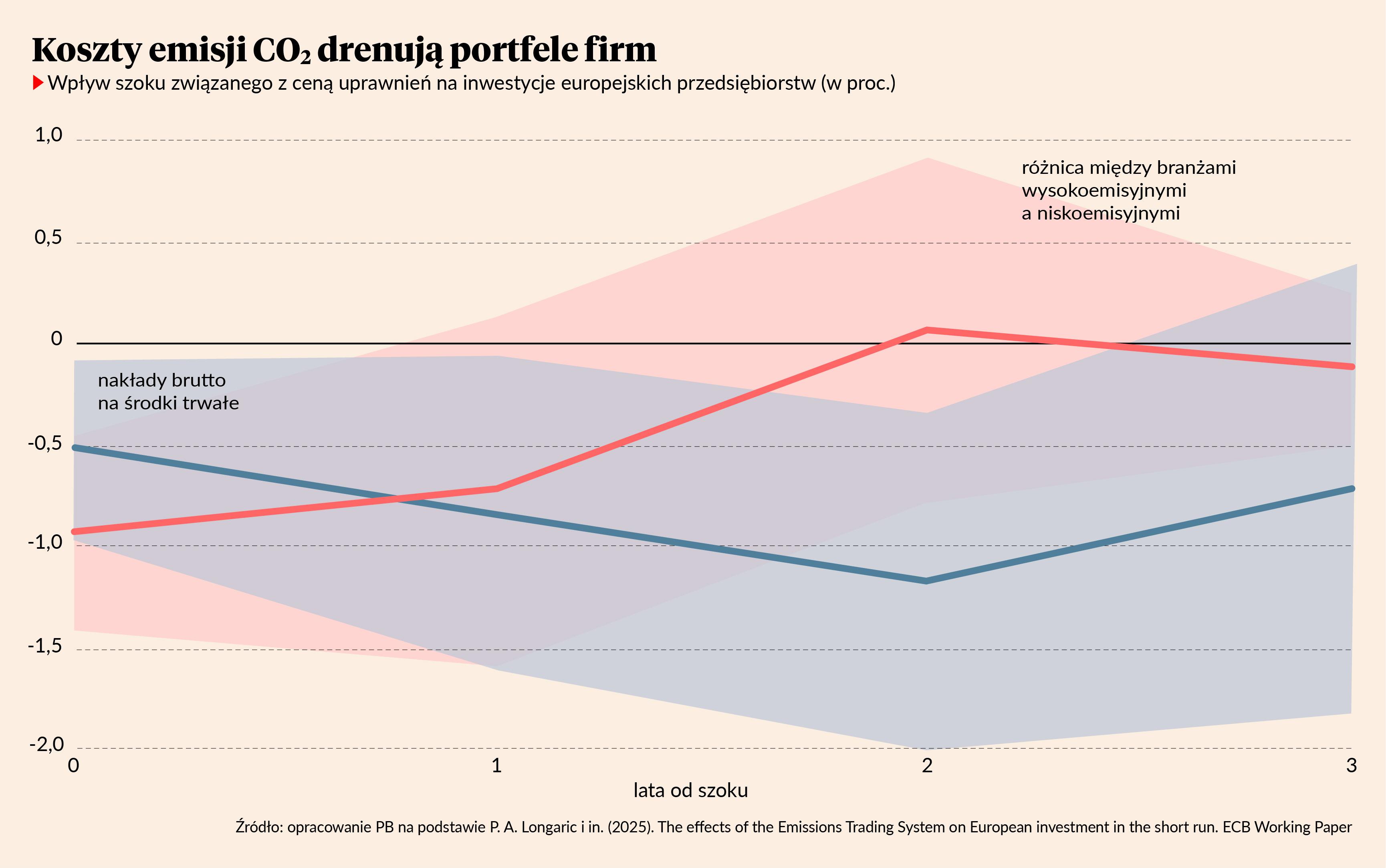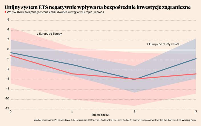 Przyjrzyjmy się liczbom, które znalazły się w analizach. Pierwsza z nich wskazuje, że inwestycje w transformację klimatyczną muszą się podwoić, bo w innym przypadku Unia Europejska nie sprosta celom redukcji emisji CO2 do 2030 r. UE potrzebuje dodatkowych inwestycji rzędu 477 mld euro rocznie (3,7 proc. PKB), czyli muszą one w zasadzie z „dnia na dzień” wzrosnąć z ok. 5,5 proc. do ok. 9 proc. PKB. Bez tych nakładów transformacja energetyczna się opóźni. W drugim opracowaniu ekonomiści szacują, że unijny system handlu emisjami negatywnie wpływa na inwestycje krajowe oraz bezpośrednie inwestycje zagraniczne (BIZ). Szok związany z cenami uprawnień, który zwiększa koszty energii o 1 proc. prowadzi do spadku nakładów brutto na środki trwałe o 0,5 proc. po roku i o 1 proc. po dwóch latach oraz obniża BIZ o ok. 6 proc. po dwóch latach. Efekty te są oczywiście zróżnicowane na poziomie sektorów, a największe spadki dotyczą branż najbardziej emisyjnych, takich jak budownictwo, transport i przemysł.