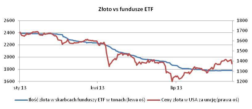Jednakże naszym zdaniem trudno trudno oczekiwać by któryś z powyższych czynników na trwałe mógł wywołać dalszy silny wzrost cen złota. Ilość kruszcu w rękach funduszy pozostaje cały czas na wysokim poziomie z perspektywy ostatnich lat. Co więcej, trudno oczekiwać by nie powróciły one do pozbywania się złota, gdy na rynku obserwować będziemy przynajmniej takie stopy procentowe w przyszłości, na jakich poziomach dyskontują je obecnie rynki. Wysokie stopy w USA w efekcie wychodzenia FED z QE3 powinny zaś dodatkowo sprzyjać sile dolara, co również nie powinno wspierać cen złota. Co do problemów z podażą złota z RPA, to nie są wcale tak poważne i najprawdopodobniej powinny ustać w najbliższych tygodniach. Napięciom w kopalniach złota daleko do tych z kopalń platyny w ubiegłym roku, albowiem koncerny wydobywcze ani południowoafrykańscy politycy nie chcą dopuścić do tak tragicznych zdarzeń jak przed rokiem.
