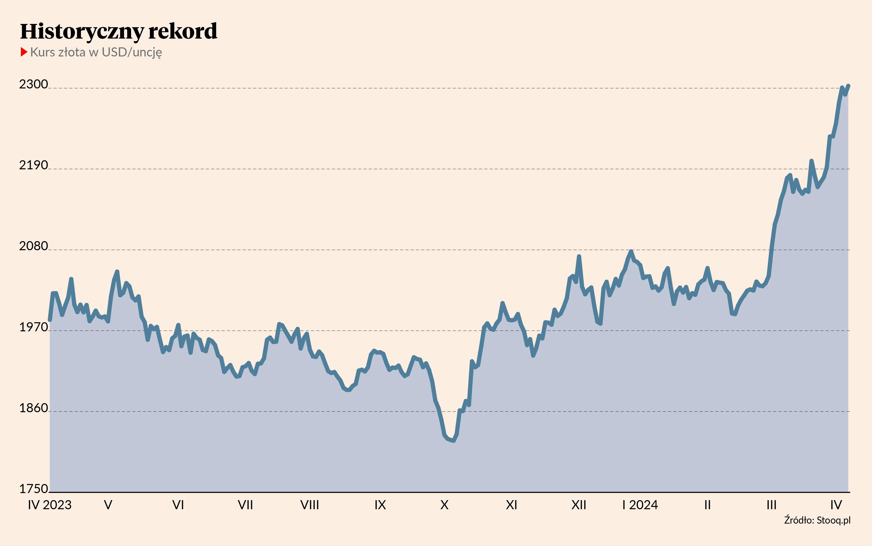Cena złota trzykrotnie testowała poziom 2000 dolarów za uncję. Działo się to w latach 2020, 2022 i 2023. Poziom ten pokonywany był jednak minimalnie i tylko na bardzo krótko, po czym notowania zaczynały spadać w kierunku 1800 USD. W 2022 r. zeszły nawet poniżej 1700 USD. Sytuacja diametralnie zmieniła się zupełnie niedawno. Jeszcze w styczniu i lutym 2024 r. cena złota oscylowała nieco powyżej 2000 USD za uncję. Z początkiem marca notowania jednak wystrzeliły, po raz pierwszy w historii przekraczając 2200 USD, a 4 kwietnia nawet 2300 USD.