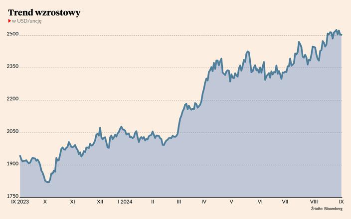 O jedną czwartą wzrosła od początku roku cena złota. Gros tego ruchu miało miejsce w marcu i kwietniu. Potem nastąpiły trzy miesiące dość szerokiego trendu bocznego, po czym w same wakacje kurs kruszcu skoczył o kolejne 200 USD, nieznacznie przekraczając symboliczne 2500 USD za uncję, co jest nowym historycznym rekordem. Co dalej? Czy będą padały kolejne bariery wyceny?