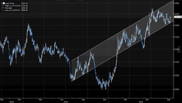 W czwartek po południu złoto denominowane w dolarze zyskuje 0,2 proc., sięgając pułapu 1336 USD za uncję, po tym jak dzień wcześniej podrożało o 1,5 proc., najwięcej od 6 września. To efekt osłabienia dolara po posiedzeniu amerykańskich władz monetarnych. Obliczany przez Bloomberga indeks dolara traci od wtorku 1,1 proc., w związku z rezygnacją Fedu z wrześniowej podwyżki stóp oraz z obniżeniem oficjalnej prognozy liczby przyszłorocznych podwyżek do dwóch.