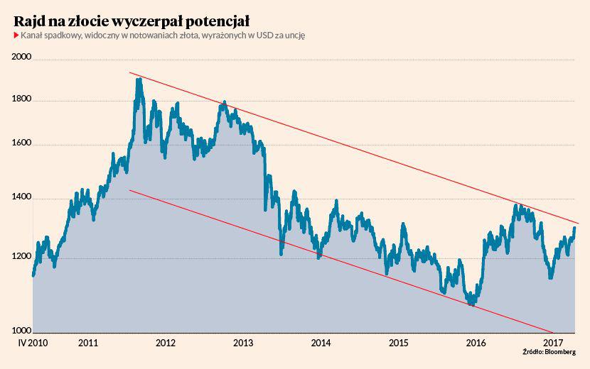Dalszy potencjał wzrostowy cen złota jest ograniczony do 1300 USD za uncję, pułapu leżącego zaledwie nieco więcej niż 1 proc. powyżej bieżących notowań. Wszystko dlatego, że właśnie na tej wysokości przebiega górne ograniczenie kanału spadkowego, opisującego trwającą od 2011 r. bessę. Dopóki nie dojdzie do trwałego wyjścia górą z kanału, scenariuszem bazowym pozostaje powrót do złota do trendu długoterminowego, czyli dalszej przeceny. W takim wypadku notowania złota miałyby szansę w średniej lub długiej perspektywie zejść głęboko poniżej 1000 USD. Dolne ograniczenie kanału przebiega obecnie na wysokości 955 USD i w ciągu roku zejdzie poniżej 900 USD, co w skrajnym przypadku oznaczałoby nawet 30-procentową przecenę złota.