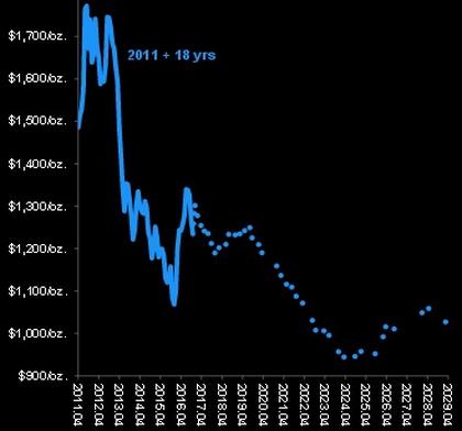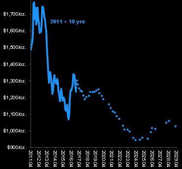 Ścieżkę, którą podążą notowania złota, wymodelowano tymczasem posługując się przeciętnymi notowaniami surowców w czasie poprzednich długoterminowych bess na rynkach towarowych. Nie można było oprzeć się na przeszłych notowaniach złota, bo pieniądz opierał się kruszcu aż do 1970 r. (jednak nie jest to duże utrudnienie, bo w obecnej bessie na rynkach surowcowych notowania złota poruszały się w sposób zbliżony do surowcowego indeksu Reuters CRB CCI). Ostatecznie spośród dotychczasowych pięciu rynków niedźwiedzia na rynkach towarowych od 1800 r. za model do prognozowania zachowania złota do końca obecnej bessy wybrano trzy.
