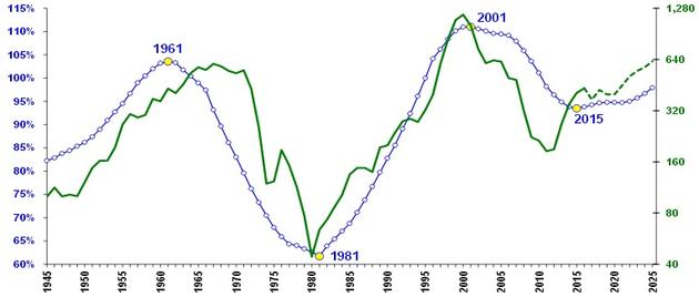 Relacja notowań indeksu S&P500 do cen złota (linia zielona, skala prawa), na tle relacji liczebności siły roboczej w wieku 35-49 lat do liczebności siły roboczej w wieku 20-34 lat (linia niebieska, skala lewa). Źródło Stifel.