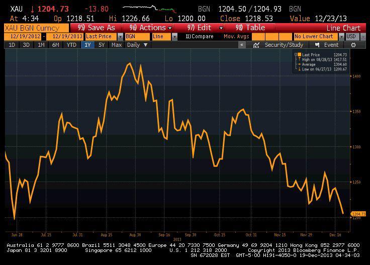 Na giełdzie w Londynie cena złota spadła o 1,5 proc. do 1199,63 USD, najniższej wartości od 28 czerwca. Na giełdzie nowojorskiej kurs złota w kontraktach lutowych spadał nawet o 3 proc. do 1198 USD. Wolumen był dwukrotnie większy niż średnia z ostatnich 100 sesji. Od początku roku cena złota spadła już o 28 proc. Wszystko wskazuje, że złoto stanie w 2013 roku po raz pierwszy od 13 lat.
