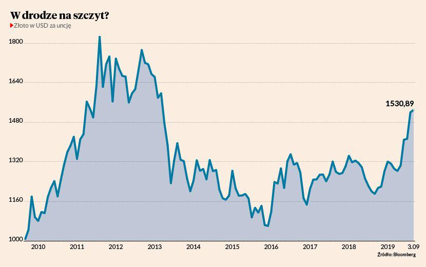 W sierpniu 2018 r. złoto kosztowało nawet mniej niż 1180 USD za uncję. Na przełomie lat 2018 i 2019 było już o 100 USD droższe. W kolejnych skokach po około 100 USD pokonało symboliczne bariery 1400 i 1500 USD. Powyżej tego ostatniego poziomu utrzymuje się niemal od początku sierpnia 2019 r. Parokrotnie przekroczyło przy tym ważny poziom techniczny, czyli 1530-1540 USD za uncję. Nie kontynuowało jednak wzrostu, ale cofało się poniżej tego przedziału.